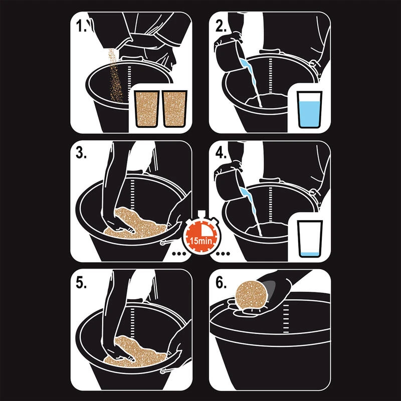 On commence tout d’abord par verser les 3/4 du volume d’eau nĂ©cessaire en mĂ©langeant Ă©nergĂ©tiquement avec la main dans un seau rond pour permettre aux particules de l’amorce de se gorger d’eau.